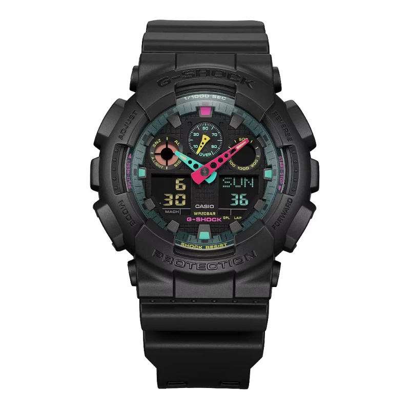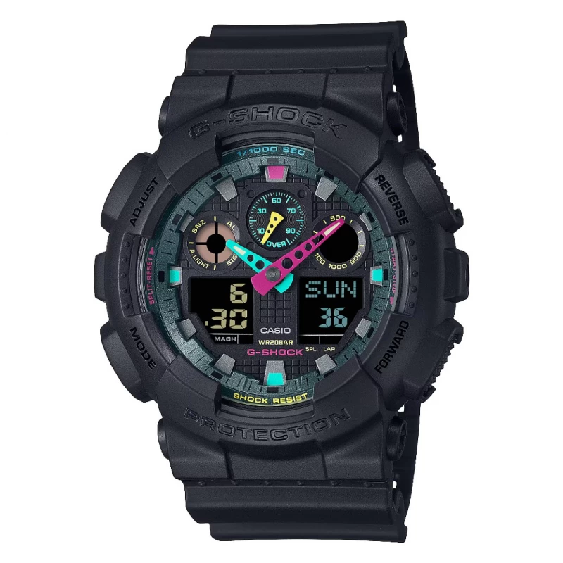 Relógio desportivo masculino da Casio G-Shock elaborado em resina com uma coloração preta matte. O design de tamanho arrojado deste modelo alia-se à paleta vibrante e fluorescente de cores presentes no mostrador que combina um sistema analógico com digital. Um acessório de caráter forte que se contrasta através da funcionalidade com a variedade de cores retratando uma imagem de força com um lado colorido divertido.